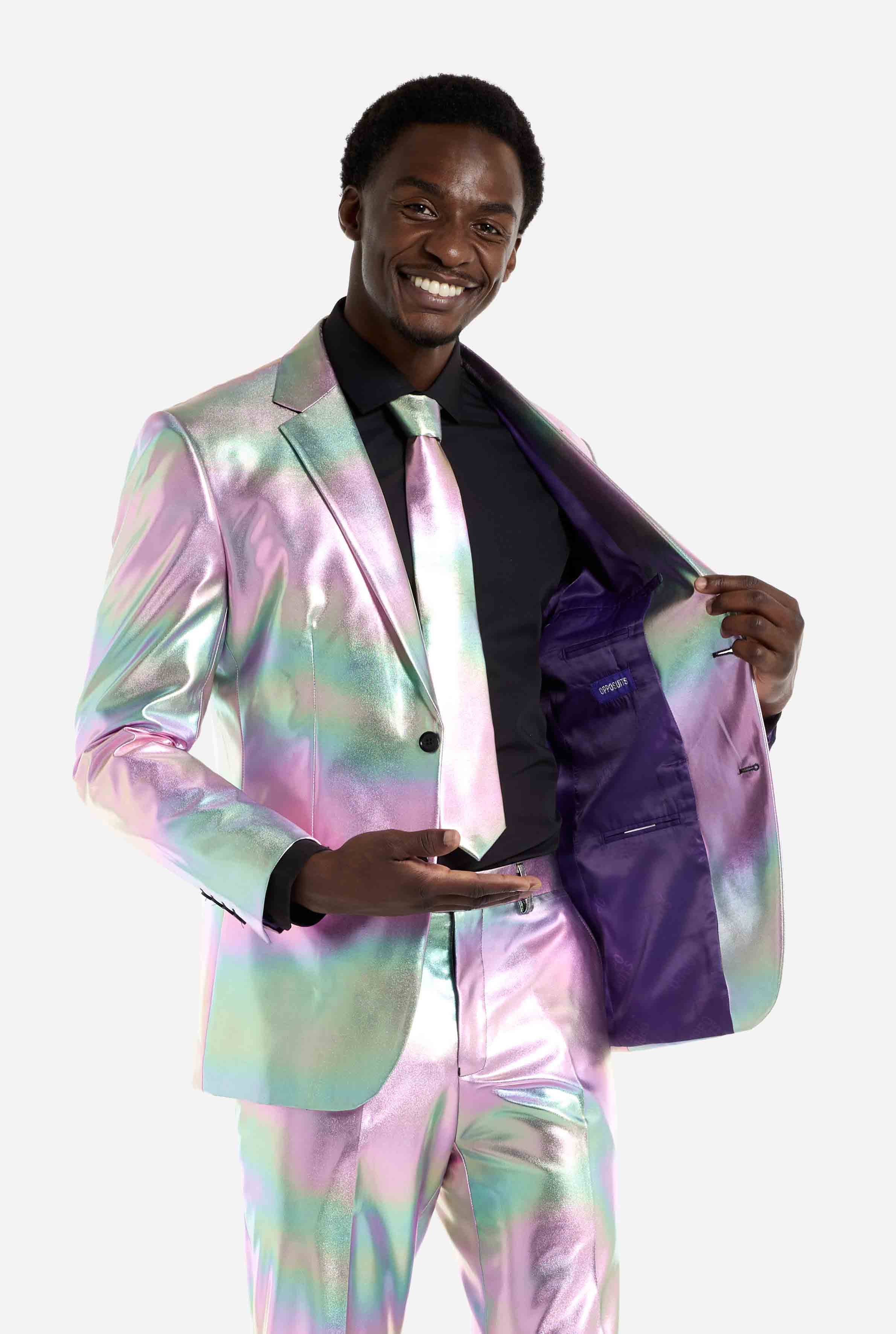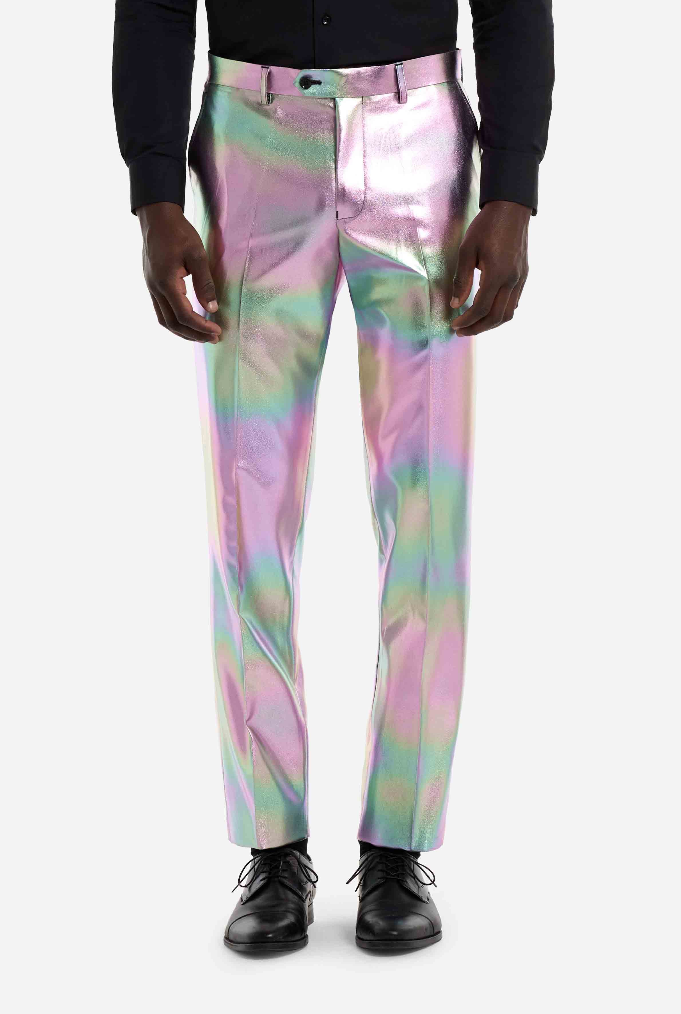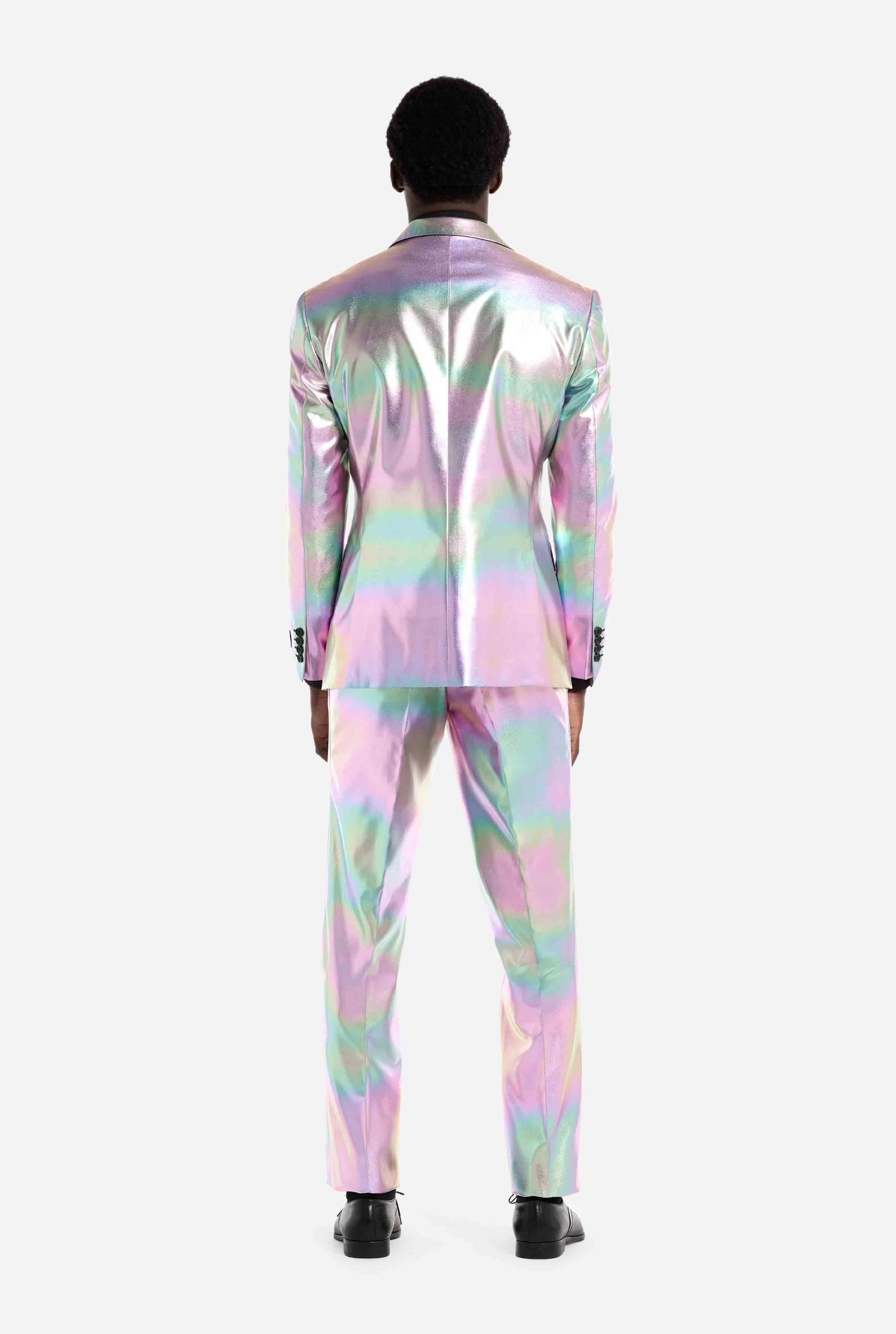 This iridescent suit showcases a stunning pearlescent sheen that shifts between soft pastels and metallic tones as you move. Under stage lights, party lighting, or daylight, the effect is impossible to ignore. Perfect for anyone looking for a holographic suit that delivers maximum visual impact.