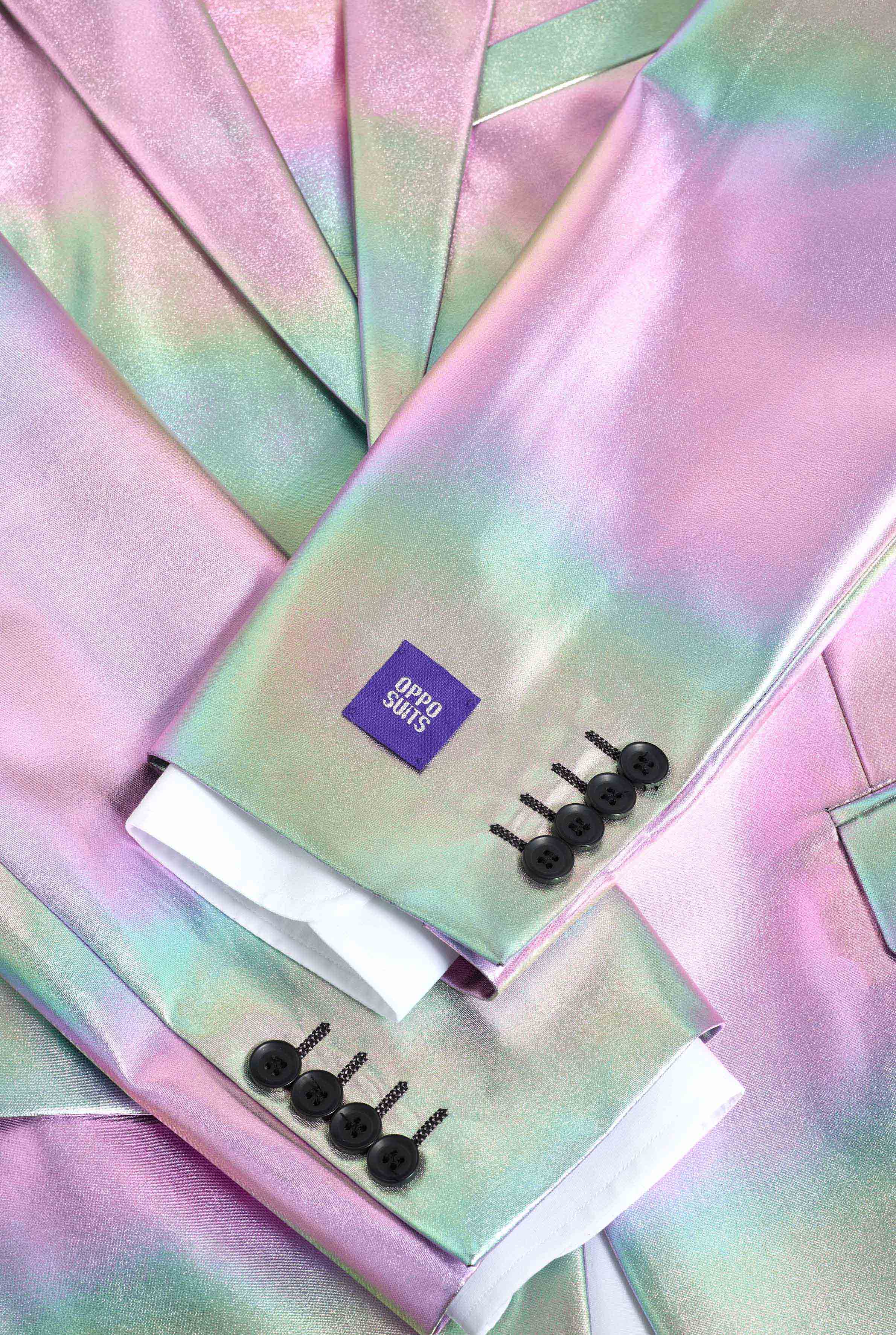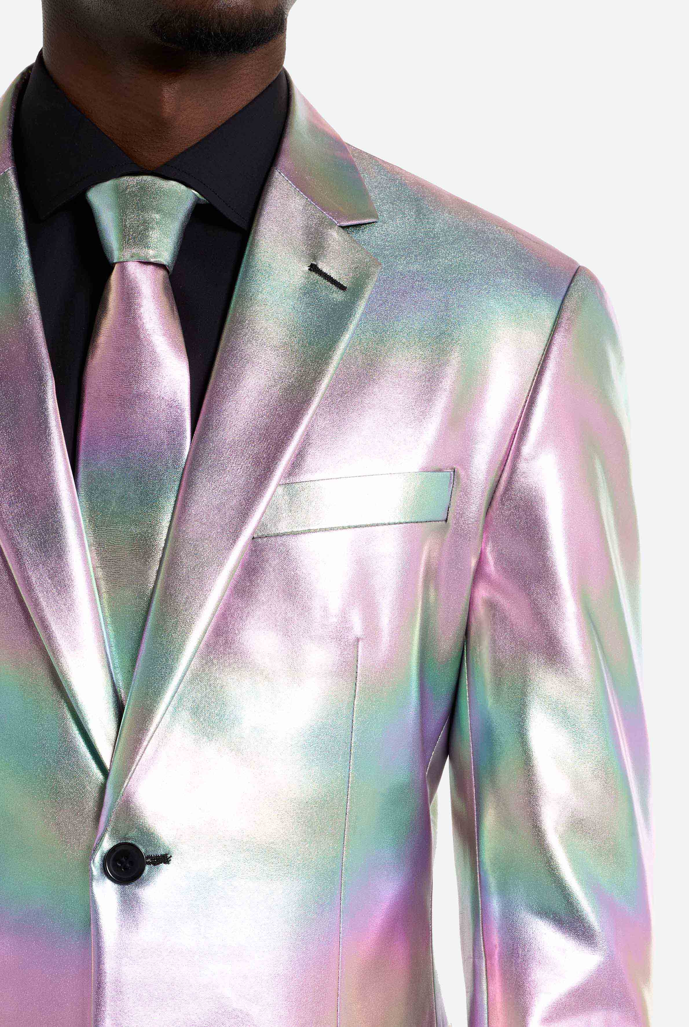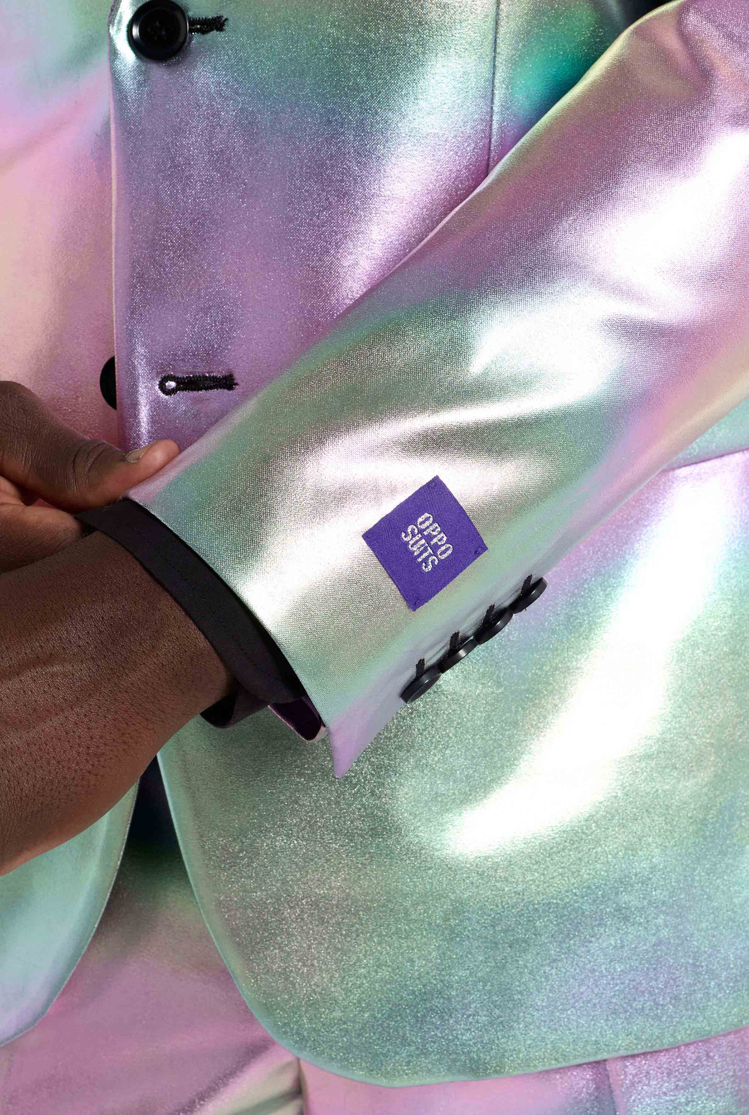 This iridescent suit showcases a stunning pearlescent sheen that shifts between soft pastels and metallic tones as you move. Under stage lights, party lighting, or daylight, the effect is impossible to ignore. Perfect for anyone looking for a holographic suit that delivers maximum visual impact.