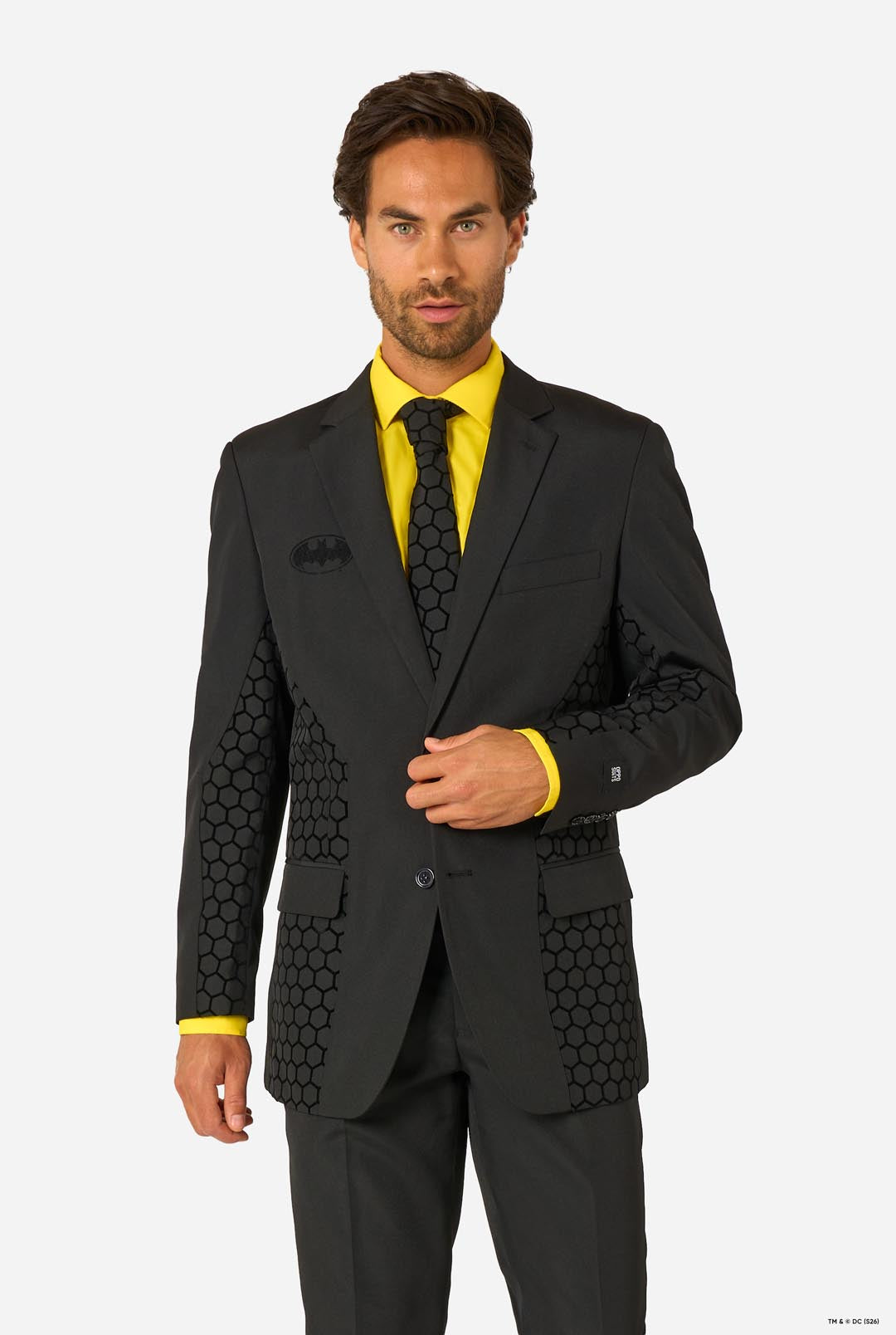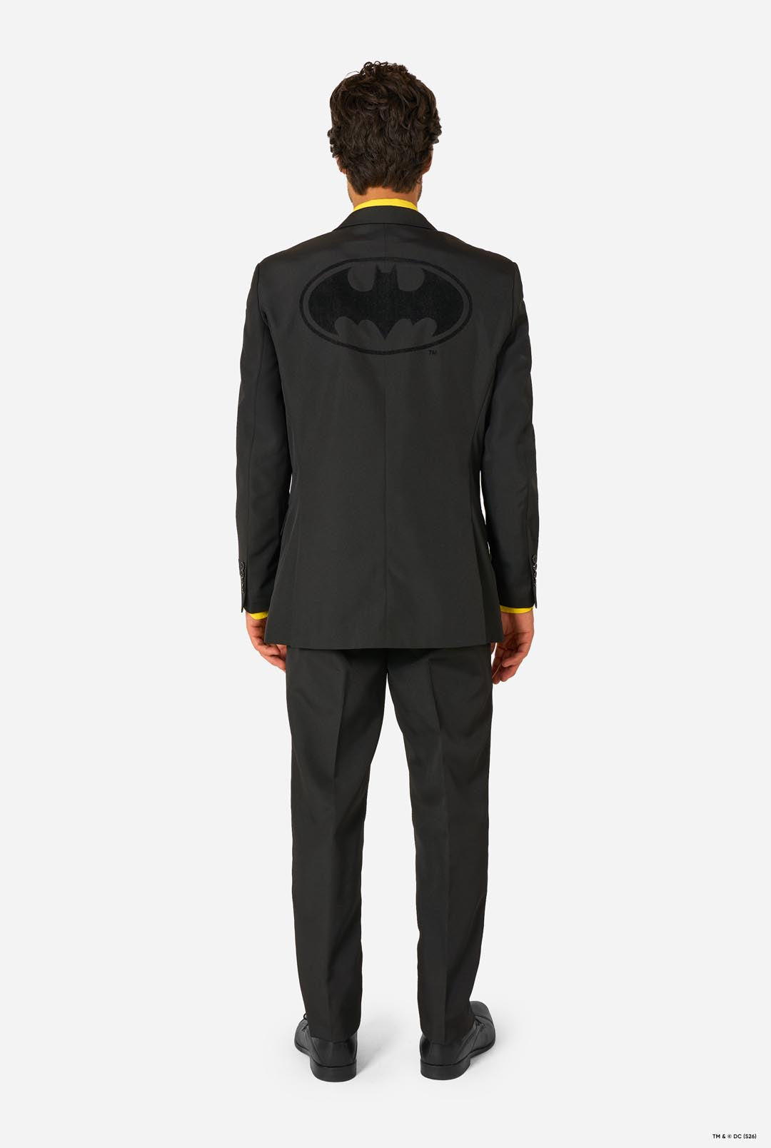 • Man opening the black Batman suit jacket to show the inner lining and branding, worn with a yellow shirt and black tie.