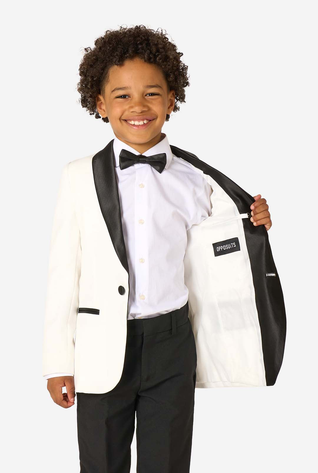 • White tuxedo with black lapels and 'OPPOSUITS' label on a white background