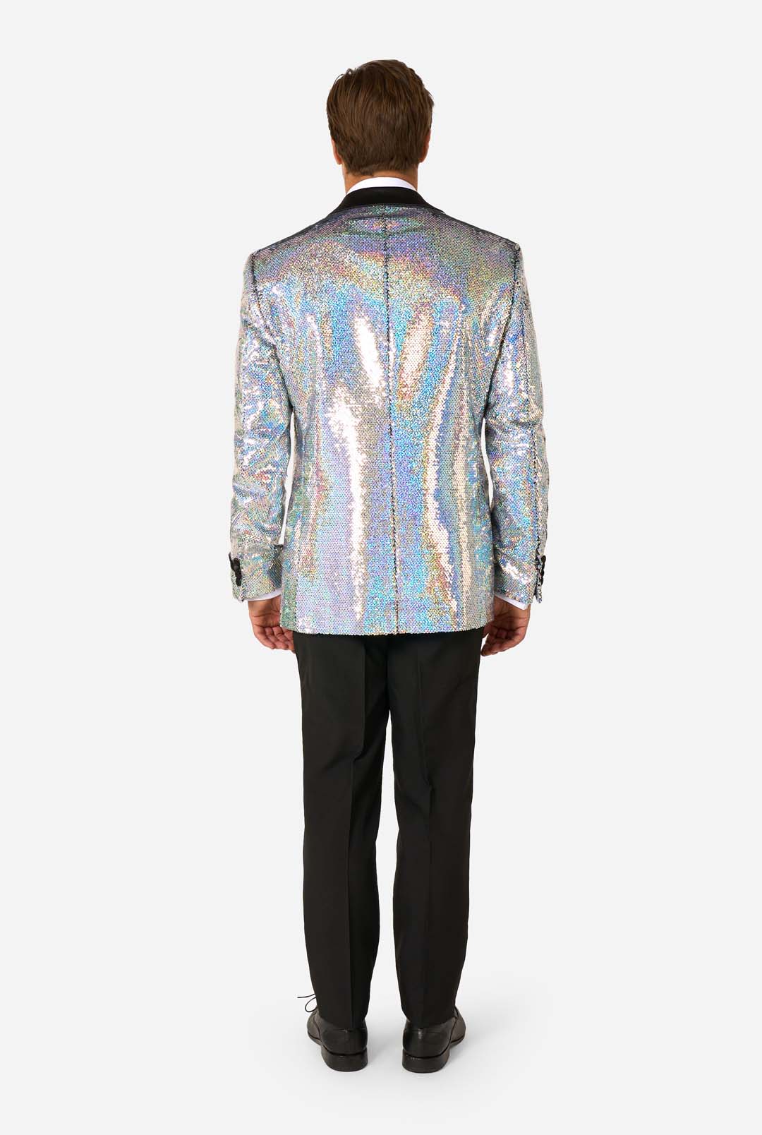 Step into the spotlight with this glossy sequin Tuxedo. The Holographic Sequins is for people in need of cyber-chic and futuristic style. Featuring a sleek satin shawl lapel and paired with classic black pleated pants, this sequin tuxedo strikes the perfect balance between sophistication, class and unmistakable flair.