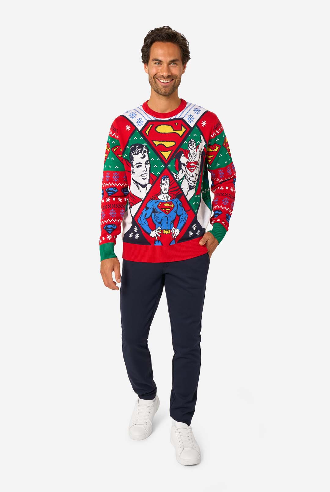 • Man wearing a colorful knitted Christmas sweater featuring multiple Superman designs and the iconic “S” logo.