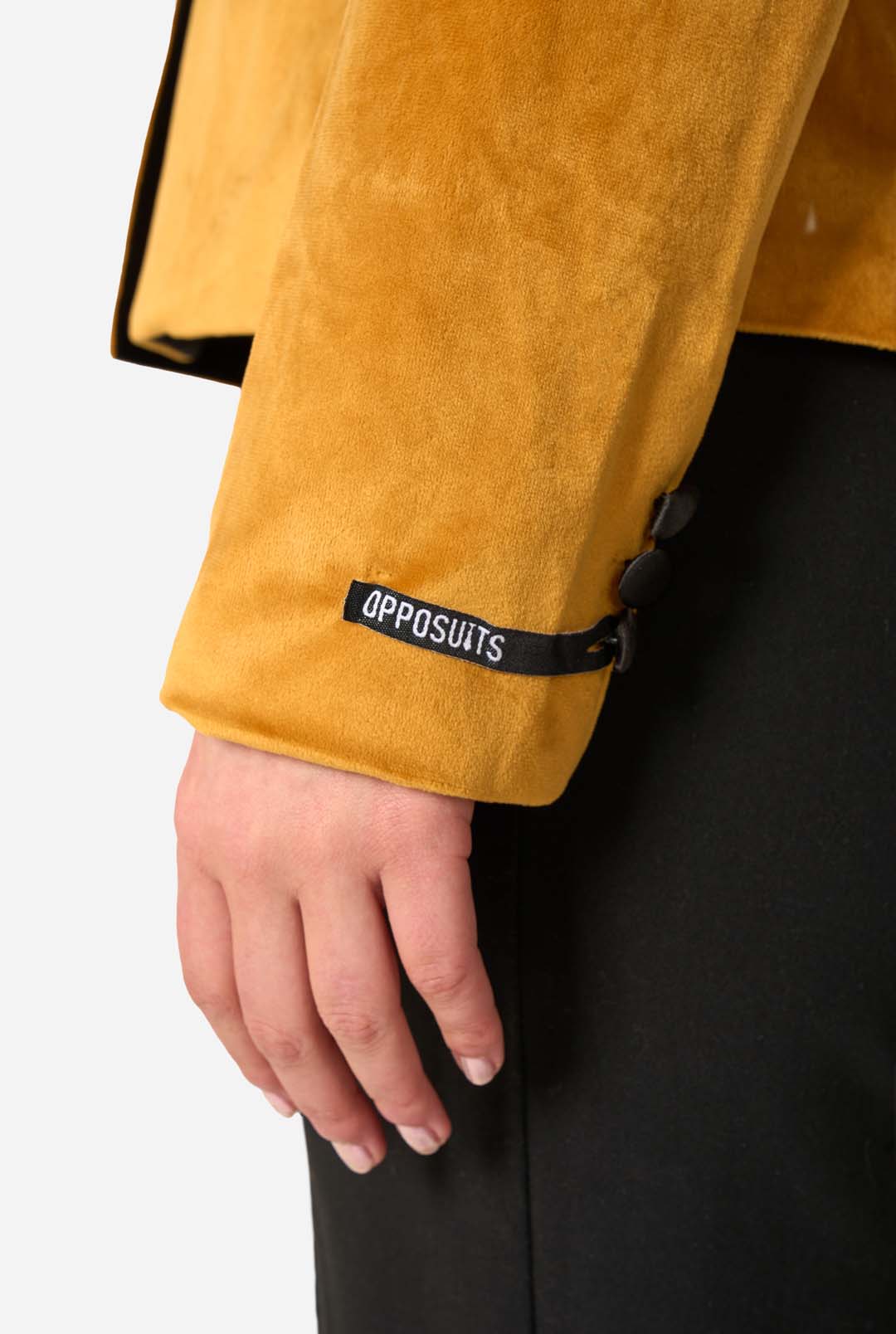 Gold is bold, and this jacket is even bolder. This Gold velvet dinner jacket with a black shawl lapel is a complementary item every woman should have in her wardrobe. The soft, smooth OppoSuits Deluxe jacket is your best friend during the entire holiday season (and beyond – it's timeless).